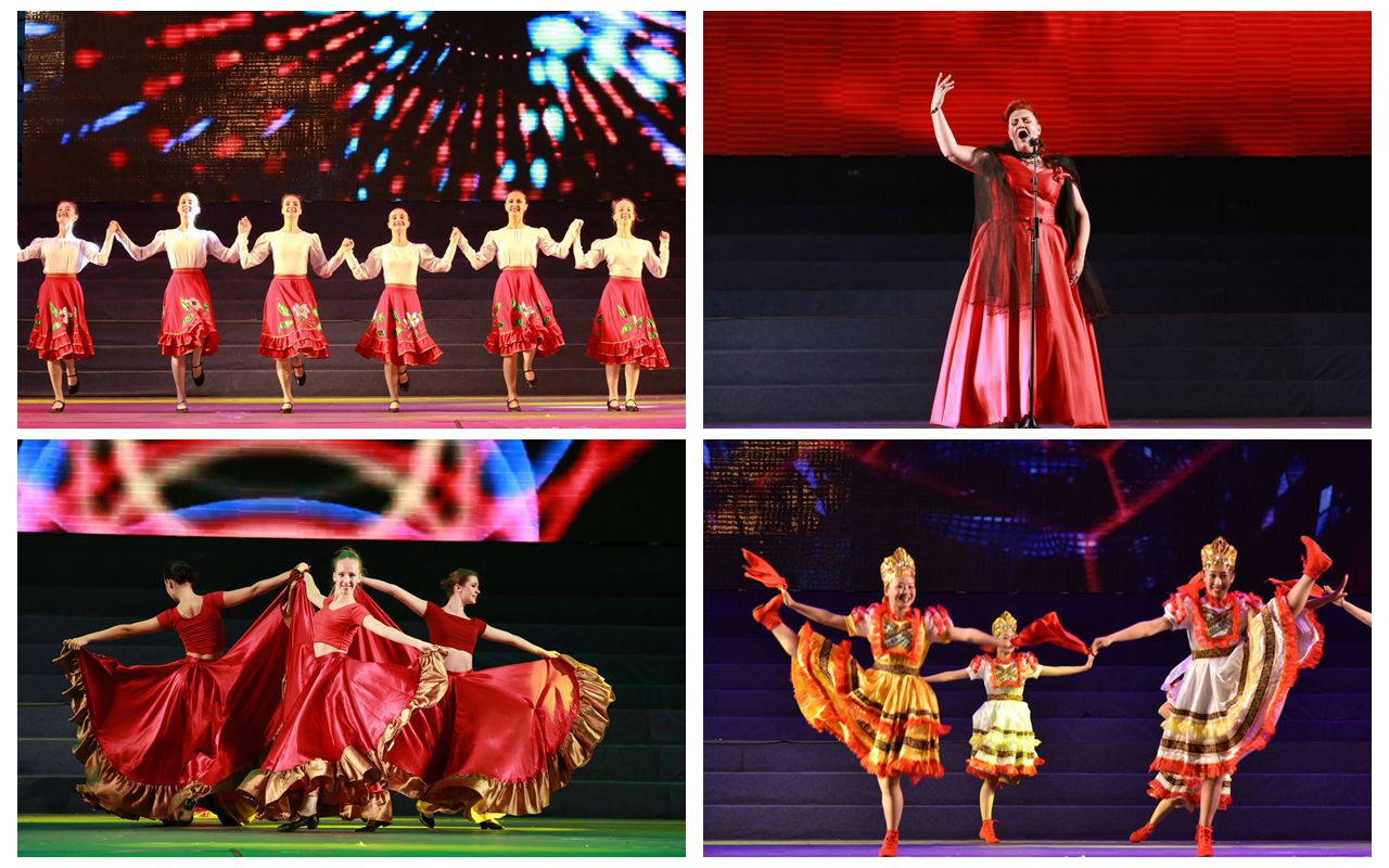 本场晚会由我校音乐学院中外师生和俄罗斯哈巴罗夫斯克国立文化学院大学生舞蹈团倾情演绎,师生们用优美的舞姿展示青春风采,用嘹亮的歌声抒发真挚情感,用优美的旋律架起友谊桥梁,现场万余名冰城观众和与会嘉宾共同感受了浓厚的中俄民族艺术魅力,见证了我校30年来中俄合作办学的丰硕成果。晚会在歌曲《嫩水渔歌》中拉开序幕,饱含达斡尔人“嫩江情结”的词作配以大气恢宏的达斡尔旋律,瞬间点燃全场观众的热情;男女生二重唱《看山看水看中国》、男生二重唱《中华好儿孙》诉说了北疆高校师生的爱国赤子心,展现了师生向着明天、向着未来、万丈雄心、脚踏实地、昂首迎接新时代的坚定信念;女生三重唱《亲亲的黑河》用优美的旋律和朴实的语言描绘了家乡黑河的美丽与发展,抒发了黑河儿女扎根龙江沃土,为全面建设现代化新龙江贡献积极力量的决心。