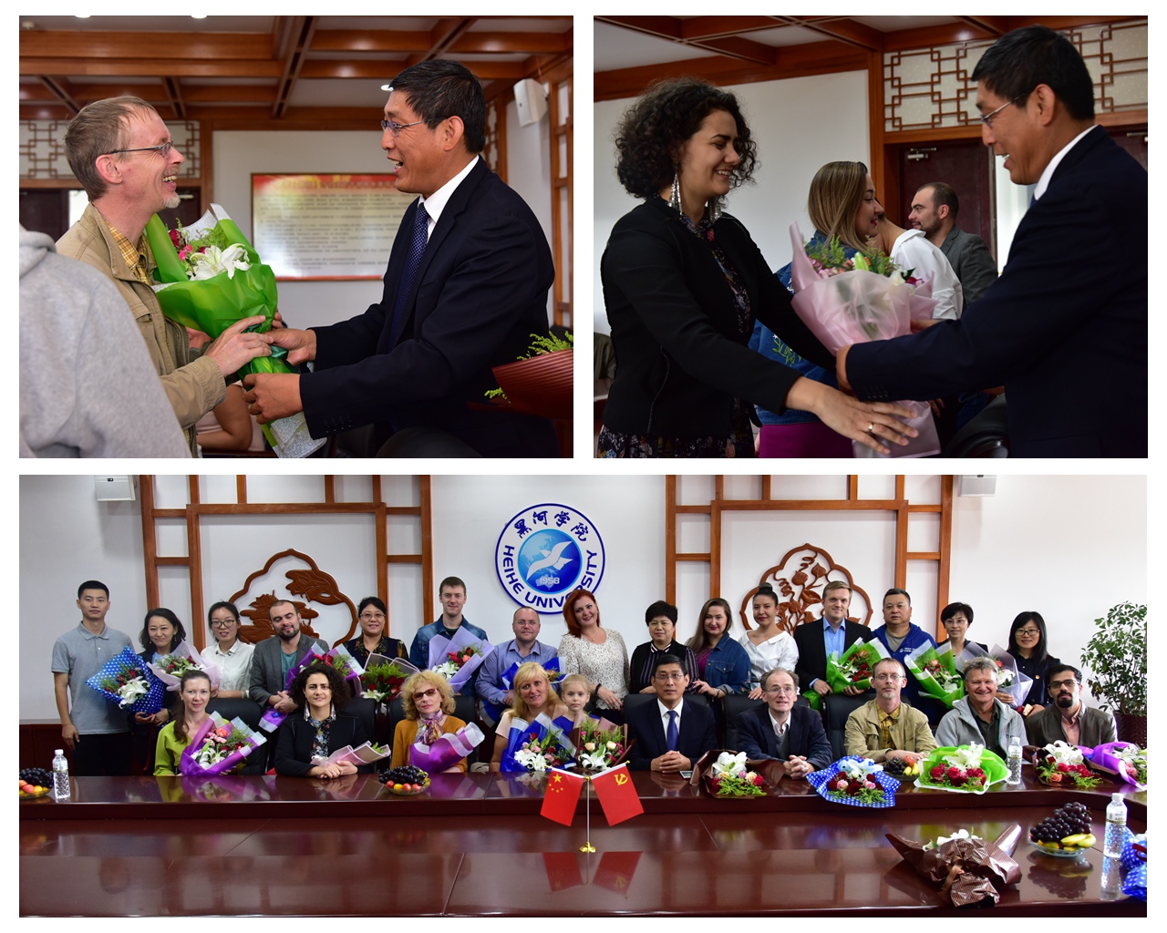 会后,副校长张焕强向外国文教专家们赠送了鲜花,并合影留念。