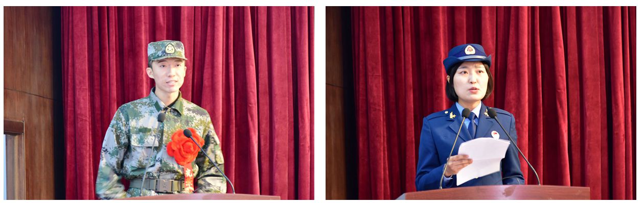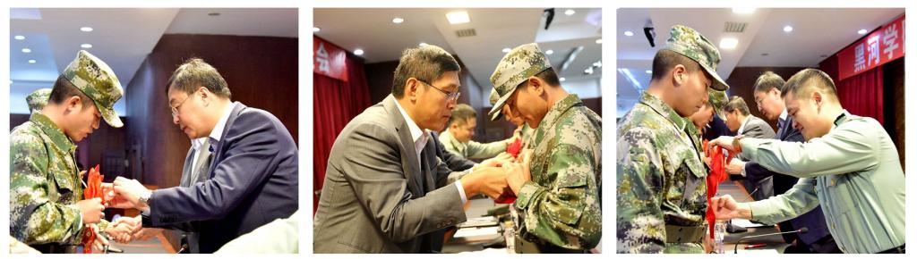 爱辉区武装部部长李伟明上校宣读黑河学院2018年大学生应征入伍名单及分配方向。2017级计算机与信息工程学院徐浩霖代表应征入伍学生感谢学校的培养,并表示在今后的部队生活中将勤学苦练,不畏艰难,服从命令,把自己锻炼为一名优秀的子弟兵,为国家的和平与安宁扛好枪,站好岗。2015级外国语学院退役复学学生李雯雯饱含深情地回忆了自己两年难忘的军旅生涯,并与14名即将入伍的学弟学妹分享了宝贵经验。