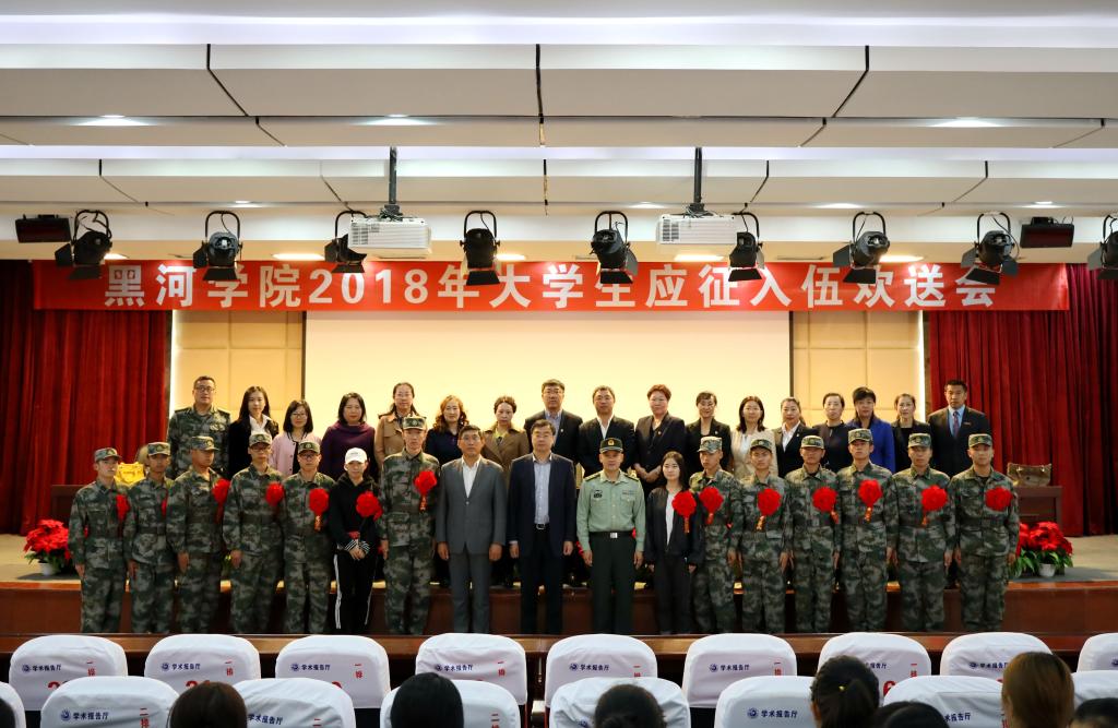 本网讯(记者 关月 摄影 彭博)携笔从戎,矢志军营。9月10日上午,学校在求知楼报告厅举行2018年大学生应征入伍欢送会。党委书记王刚、副校长张焕强,黑河市爱辉区武装部部长李伟明上校,党委(校长)办公室、学生工作部(处)·武装部、保卫处等相关部门负责人及各学院党总支书记、副书记和辅导员代表参加了欢送会。
