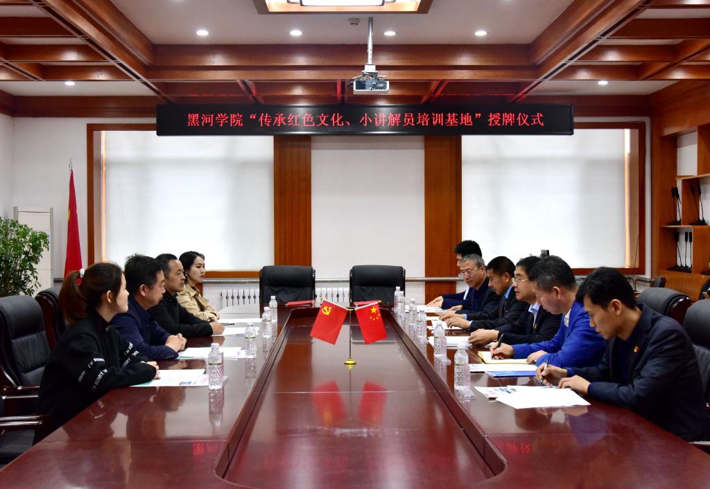 传承红色基因,弘扬革命精神。9月12日上午,我校中苏抗战历史纪念馆与黑河市第五小学、幸福中学共建的“传承红色文化 小讲解员培训基地”在明德楼二楼会议室举行授牌仪式。黑河市第五小学校长马书彬、幸福中学副校长朱作良,我校党委书记王刚、副校长丛喜权及远东研究院、团委、学生工作部相关部门负责人参加授牌仪式。