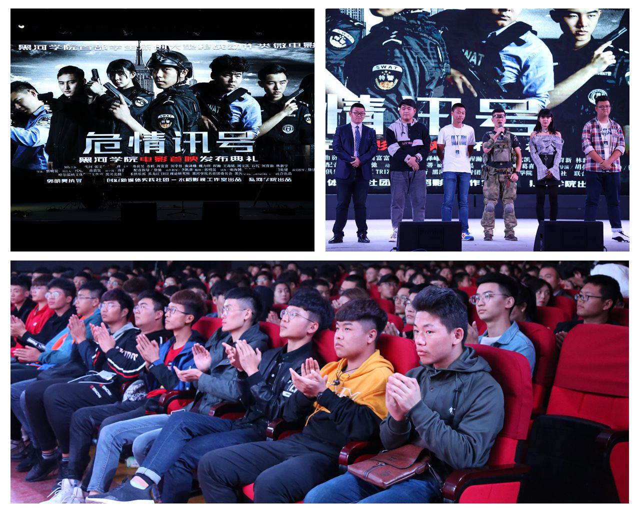 本网讯(记者关月 摄影 李佳 王振辉)一袭青春梦,醉卧电影中。9月19日晚,我校创新新媒体实践社团水稻影视工作室自编、自导、自演、自制的枪战动作微电影《危情讯号》首映式在明德楼礼堂举行,这是我校学生原创公映的首部微电影,800余名师生参加首映式并观看影片。黑河电视台、黑河封面、黑河日报、爱辉新媒体、爱辉电视台等多家媒体对活动进行详细报道。