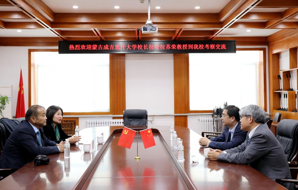 本网讯(记者 关月)9月17—19日,蒙古国成吉思汗大学校长拉布嘎苏荣来访我校,党委书记王刚、校长贯昌福与拉布嘎苏荣校长就两校师生互访、学术交流等事宜进行商谈,并达成合作共识。