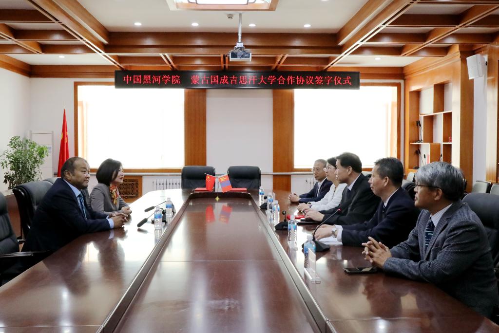 双方就师生互访、学科专业建设、联合组建科研团队、学术文献资源共享等校际合作项目进行了深入探讨和交流,并达成广泛共识,现场签订《中国黑河学院与蒙古国成吉思汗大学合作意向书》;校长贯昌福代表学校聘请拉布嘎苏荣校长为我校客座教授,并向他颁发聘书。