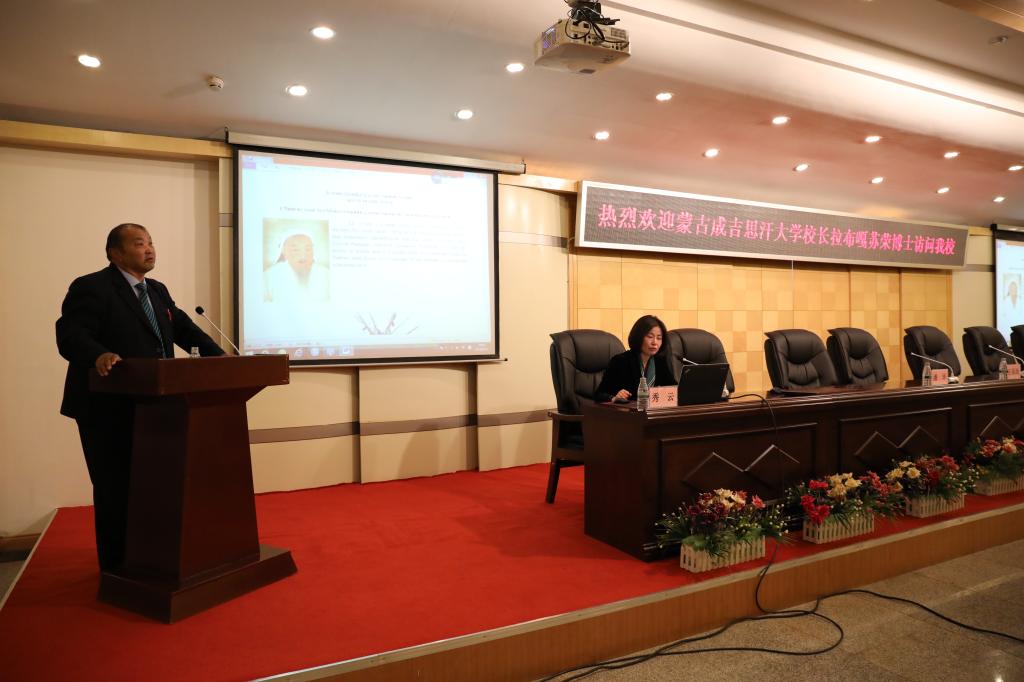 在《论成吉思汗的历史贡献》报告中,蒙古成吉思汗大学校长拉布嘎苏荣教授结合国际上的成吉思汗研究成果,系统介绍了成吉思汗统一蒙古高原、对中亚地区的征服以及建立四大汗国的历史,肯定其对打通中西交通特别是丝绸之路、促进中西经济文化交流的历史功绩。