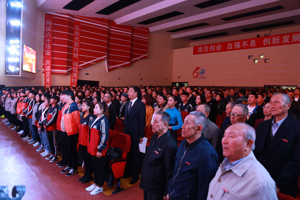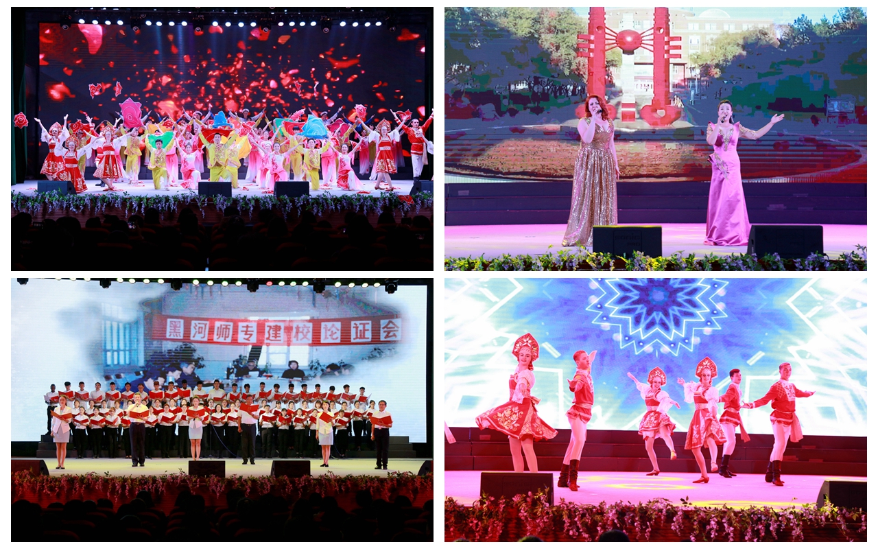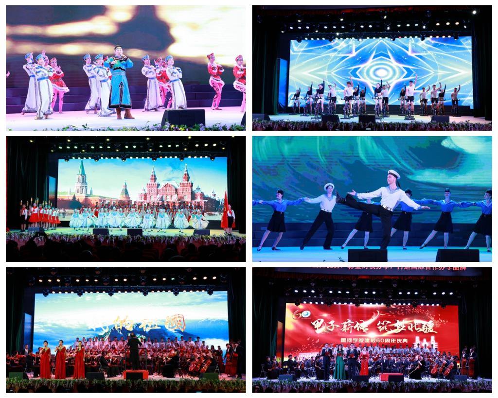 庆典大会中,中外师生、校友代表、附中附小学生代表及离退休老领导、老教师以精心准备的节目为学校60年校庆献礼。由我校音乐学院舞蹈团、俄罗斯布拉戈维申斯克国立师范大学舞蹈团联合带来的《绢舞青春》,将东北秧歌手绢花技巧和俄罗斯传统舞蹈有机结合,充分展示了我校特色办学成果,实现了“舞蹈之美”与“中俄友谊”的完美统一;音乐学院外教斯维塔和校友韩雨佳一曲《锦绣前程》以深情的演唱表达了中外师生对母校的真挚祝福;“亲亲的黑河学院啊,我为您放声歌唱,我们共同创造更加美好、更加灿烂的明天”,由朱红岩、曹福全、刘丽明三位老师创作,原党委书记姜义男、副校长丛喜权、教师代表曹福全、爱辉区校友代表孟晓丹、在校生代表王郇、附属中学学生王新奇朗诵的《永远的家园》,表达了他们对学校历史的追忆和对未来发展的自信与自豪;音乐学院教师程一民演唱的《嫩水渔歌》,将达斡尔人“嫩江情结”的词作配以大气恢宏的达斡尔旋律,瞬间点燃全场观众的热情;俄罗斯布拉戈维申斯克国立师范大学舞蹈团表演的《水兵舞》气势激昂、风采盎然,让现场观众眼前一亮;体育学院学生的动感单车表演将舞动与运动相融合,充分展示了我校学生的青春活力和精神风貌,将现场气氛推向高潮;由吴晓莉、崔安宁、樊秋玥三位老师领唱,退休老教师怀斌指挥,音乐学院合唱团、爱辉区校友代表、教师代表和留学生代表合唱的《我的祖国》《黑河学院院歌》深情演绎“再创辉煌,奔向明天”,唱出了岁月流逝下的黑河学院情怀,很多校友为之触动,情不自禁流下热泪。