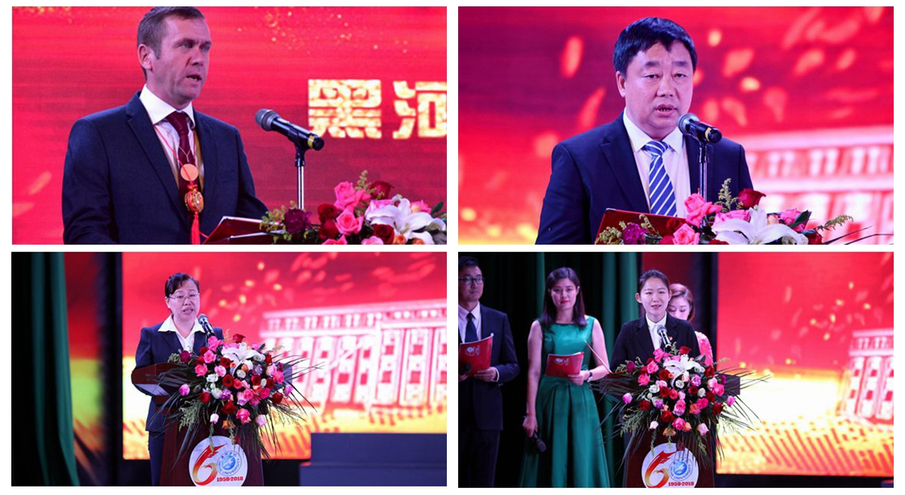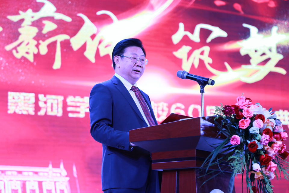 黑河市委书记秦恩亭在庆典大会上致辞。他指出,黑河学院是黑河市唯一的高校,也是区域经济发展的重要人才库,希望黑河学院以60周年校庆为新起点,登高望远、乘势扬帆,坚持走内涵发展、创新发展、特色发展和开放发展之路,在全省全国乃至中俄战略合作大局中提升发展定位,做好学校专长放大、地方所需对接、中俄合作深化、高校协同合作“四篇文章”。他表示,黑河市政府将一如既往支持黑河学院发展,在长远规划、校园环境建设、学生就业创业、校地合作共建等方面开通“绿色通道”、给予顶限支持。