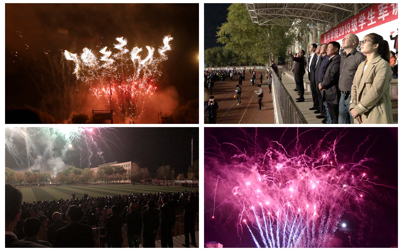 晚上八点,庆典焰火表演在万众期待的目光下开始。无数道焰火划过天际,火树银花盛开在运动场上空,时而金光绽放,时而月夜幽蓝,有如喷泉直上九霄,也有如华盖徐徐下落,“仙女散花”“银色瀑布”“喜庆灯笼”等特色焰火照亮了整个北疆校园。