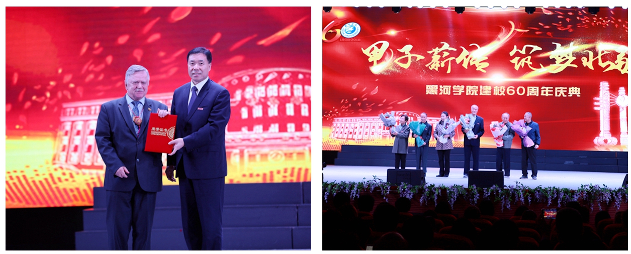 校长贯昌福向与我校有三十年友好合作的俄罗斯布拉戈维申斯克国立师范大学原校长谢尔吉延科·尤里颁发黑河学院国际教育交流合作特别贡献奖。学校的荣耀离不开那些胸怀理想、心系家国的老教师们的无私奉献和辛勤耕耘,在校学生为老教师代表献上满怀敬意和祝福的鲜花。