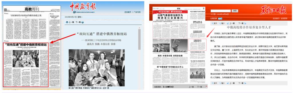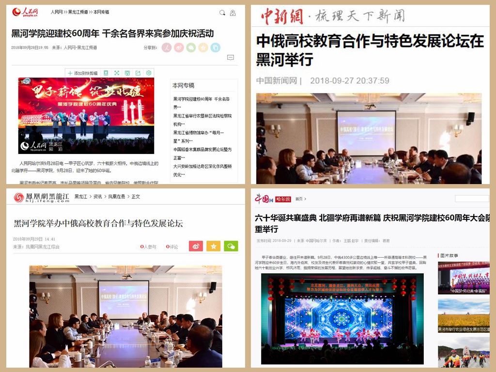 校庆期间,《中国教育报》以“‘双向互通’搭建中俄教育枢纽站——黑河学院三十年走出中外合作特色办学路”为题、《黑龙江日报》以“中俄高校将合作培养复合型人才”为题对我校突出对俄合作办学特色,为服务地方经济社会发展所作出的重要贡献给予专题报道;中国教育电视台、黑河电视台、爱辉电视台对校庆盛况进行了报道;网易新闻对校庆盛典和音乐学院校庆专场晚会作了现场直播。与此同时,人民网《黑河学院迎建校60周年千余名各界来宾参加庆祝活动》、光明网《黑河学院60年为社会输送7万余名高素质应用型人才》、新华社客户端《黑河学院举办中俄高校教育合作与特色发展论坛》、中国网《六十华诞共襄盛典北疆学府再谱新篇庆祝黑河学院建校60周年大会隆重举行》、中国新闻网《黑河学院建校60周年大会隆重举行》、凤凰网《黑河学院举办中俄高校教育合作与特色发展论坛》、东北网《15所中俄高校负责人齐聚黑河 共商教育合作大计》、黑河封面《这场“镜像”穿越之旅,带你找回60年前的黑河学院~》、今日黑河《黑河一六旬“老人”过生日,上万人为她庆生,还有焰火表演…》、亲亲黑河《黑河学院生日快乐》等新闻报道也纷纷对我校60周年校庆系列活动进行了进行了集中展示和宣传推介。