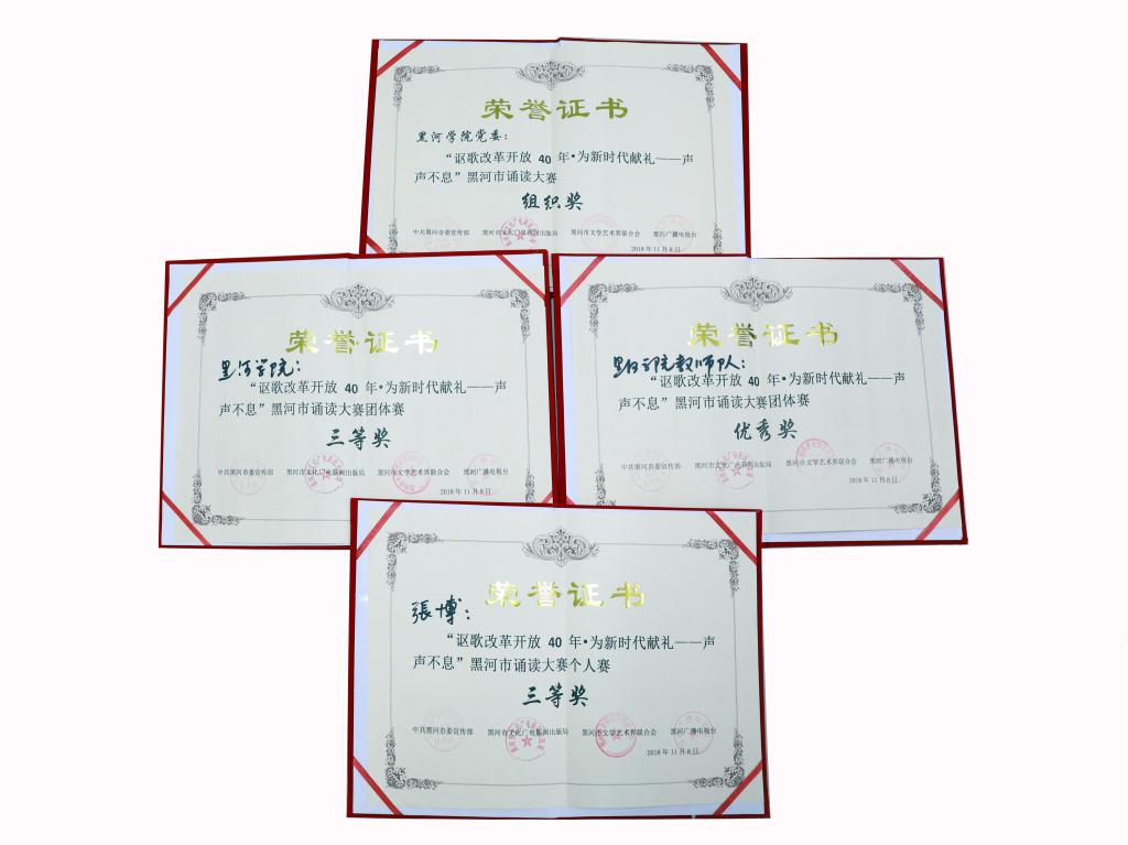 本网讯(记者 杨志超)11月8日,由黑河市委宣传部、市文广新局、市文联联合举办的“讴歌改革开放40年·为新时代献礼——声声不息”朗读大赛如期举行,我校参赛师生获个人奖3项,团组奖2项。学校党委宣传统战部、团委、工会等部门经过精心组织,共选送11项个人作品、5项团队作品参加诵读,诵读作品立意紧扣主题,选手诵读水平优秀,学校荣获最佳组织奖。