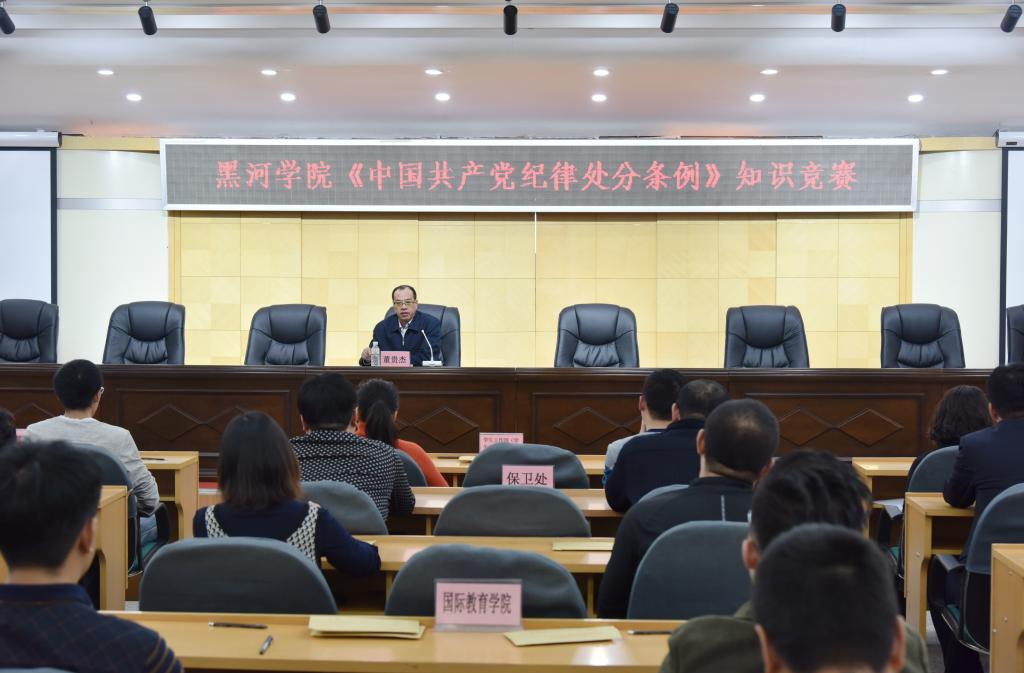 赛前,纪委书记董贵杰围绕党的纪律内涵和特点、组成部分、主要内容及黑龙江省党员干部违纪违法的八大表现,同参赛党员干部进行交流。他希望全校广大党员干部积极主动学习贯彻《中国共产党纪律处分条例》,做到熟知精通,学以致用,内化于心、外化于行,立志、修心、严行,做一名合格的共产党员。