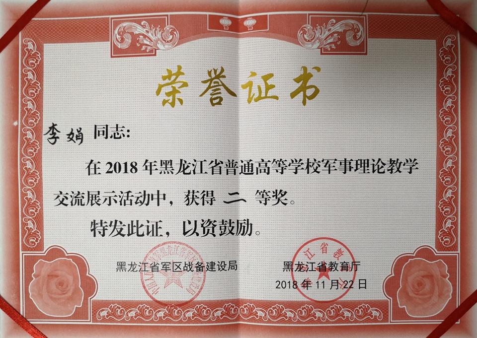 本网讯(特约记者 么洪伟)11月20-21日,由黑龙江省军区战备建设局、黑龙江省教育厅联合举办的“2018年黑龙江省普通高等学校军事理论教学交流展示”教学比赛决赛如期举行,我校通识教育学院选派3名军事理论课教师参赛,李娟老师荣获比赛二等奖。