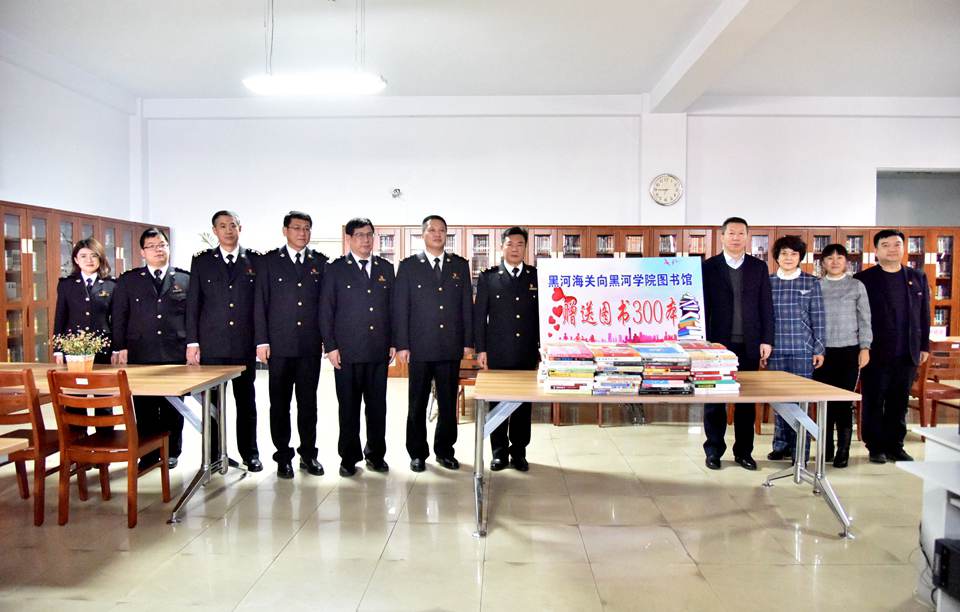本网讯(记者 赵宇)12月11日,黑河海关(原黑河出入境检验检疫局)局长张有才一行9人代表黑河海关向我校图书馆赠送300册书籍,进一步丰富我校图书资料。副校长丛喜权、图书馆馆长李秀娟及图书馆相关人员参加赠书仪式。