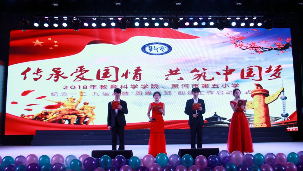 教育科学学院党总支书记闫英在“第三届周恩来班”创建启动仪式上致辞,教师代表宣读创建活动方案,全体师生现场宣誓,齐唱黑河学院校歌。