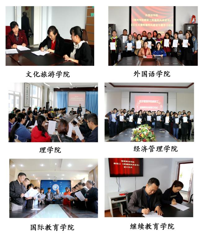 学习活动历时两周,重点学习解读教育部印发的《新时代高校教师职业行为十项准则》《关于建立健全高校师德建设长效机制的意见》及黑龙江省教育厅印发的《高等学校在职教师从业行为“十禁止”》《高校教师师德失范行为处理办法》。在学习领会上级精神基础上,5月29-30日,全校各学院、行政与教辅单位人员采取解读、宣誓等形式,组织全体教职工签订了《黑河学院教职工师德师风承诺书》。
