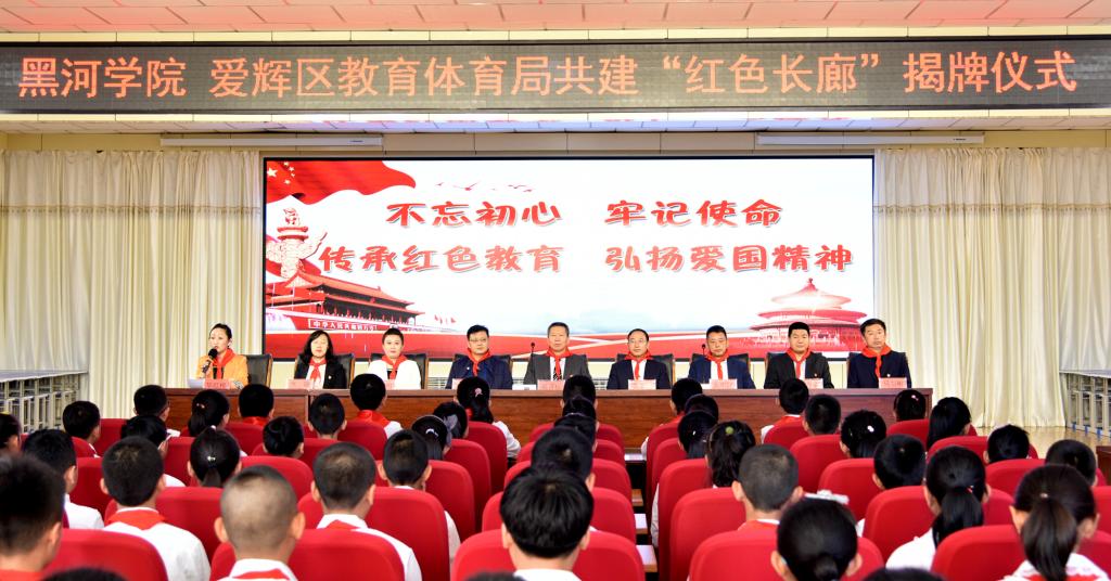 本网讯(记者 关月)6月5日,黑河学院附属小学在五楼多功能厅举行“红色长廊”揭牌仪式,副校长丛喜权、远东研究院院长谢春河、中苏抗战历史纪念馆馆长崔继舟,黑河市教育局调研员黄凤来、爱辉区政府副区长孟宪辉、黑河市委宣传部副调研员张立群、爱辉区教育体育局副书记张敬、黑河学院附属小学校长马书彬及中苏抗战历史纪念馆爱国者社团讲解员、附属小学小讲解员百余人参加揭牌仪式。