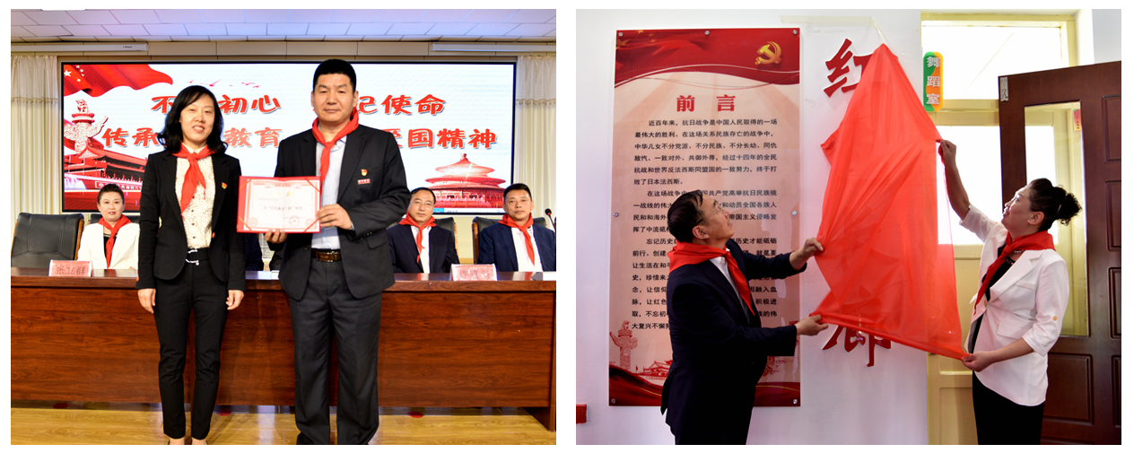 揭牌仪式上,爱辉区教育体育局副书记张敬为崔继舟馆长颁发“红色教育”推广使者聘书;远东研究院院长谢春河与黑河市委宣传部副调研员张立群为“红色长廊”揭牌,与会人员共同参观“红色长廊。
