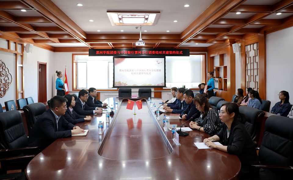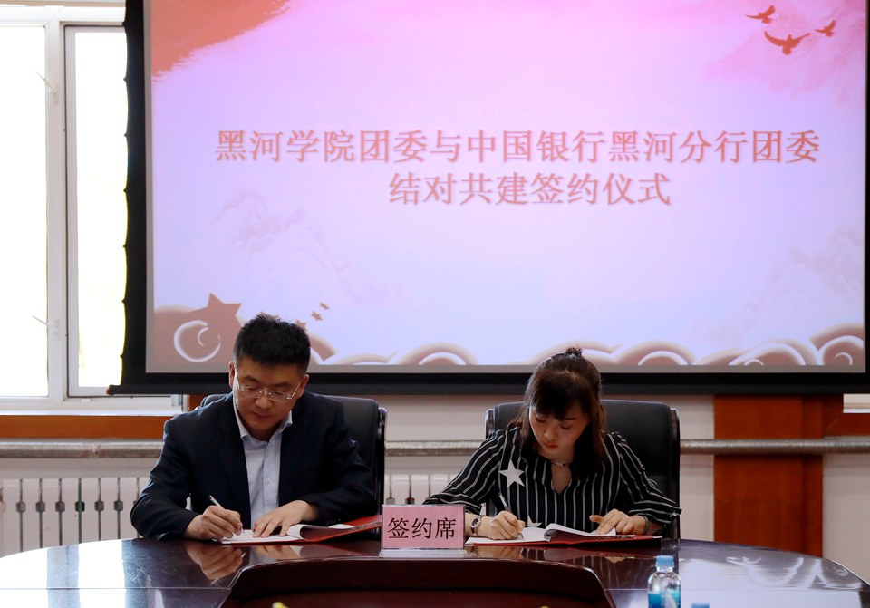 会上,校团委负责人赵晓娜与中国银行黑河分行团委书记杨超共同签署了黑河学院团委与中国银行黑河分行团委共建协议。