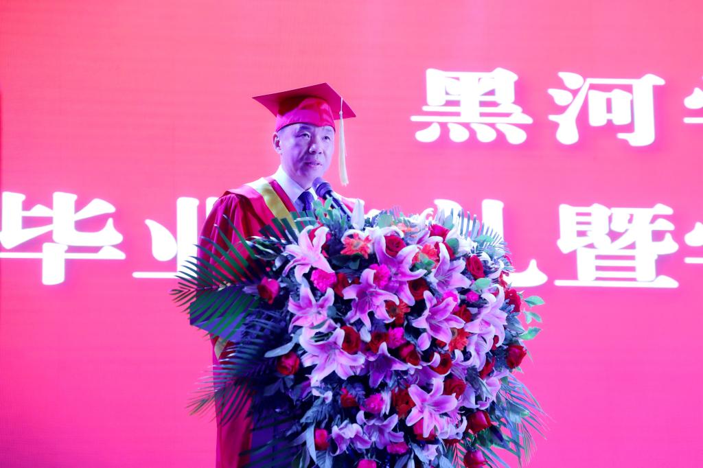 在热烈的掌声和欢呼声中,校长贯昌福在毕业典礼上深情致辞。他代表学校对圆满完成学业的同学们表示祝贺,向多年来为学生健康成长付出辛勤劳动的广大教职工表示敬意。贯校长指出,四年前,你们怀揣梦想进入黑河学院,四年中,你们在学习中转变,在转变中成熟,今天,你们满载而归,奔向前程。贯校长对毕业生为学校发展建设所作出的贡献表示衷心的感谢,勉励毕业生要胸怀大志,筑牢理想信念,做一个志存高远、追求卓越的人;要感恩社会、感恩时代、感恩生活,做一个品德高尚、常怀仁义之心的人;要爱国守法、明理诚信、敢于担当,做中华民族传统美德的继承者和弘扬者;要勤于思考、善于学习、敢于创新、追求真理,做一个勤学善思、苦干实干的人。要把吃苦当作磨砺自己的机会,把实践当作锻炼自己的舞台,依靠勤劳和汗水在新时代干出一番事业,创造无愧于时代的骄人业绩。贯校长激动地说:“母校将是你人生旅途中永远的港湾、坚强的后盾、温暖的家,你们也是母校永远的牵挂。”