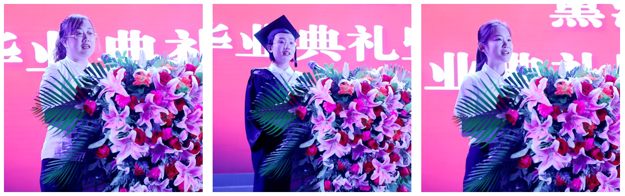理学院孙莹代表毕业生表达了对母校培养及老师教导的崇高敬意和衷心感谢,表示未来将继续秉承北疆精神,在各自的岗位上兢兢业业,无愧于老师的辛勤培养,无愧于母校的殷切期盼,勇做时代前列的奋进者、开拓者、奉献者。