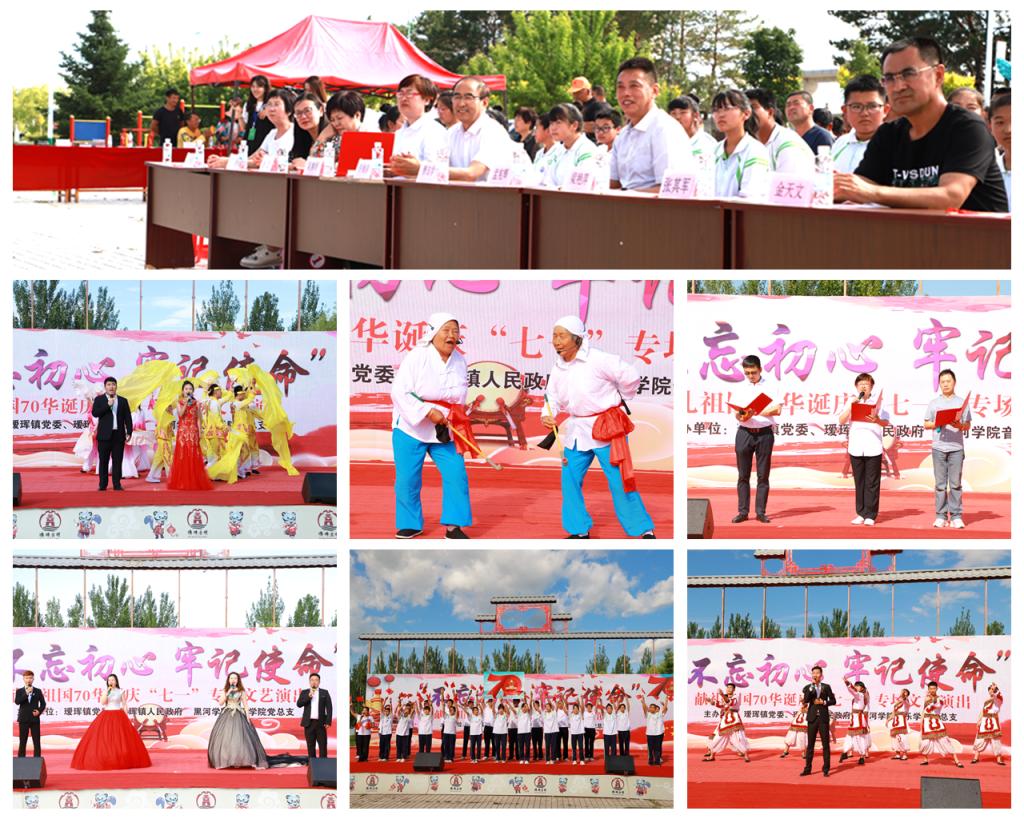 本网讯(实习记者 张瑞芹 特约记者 张博)6月21日,以院镇共建活动为契机,我校音乐学院党总支与瑷珲镇联合举办了“不忘初心·牢记使命”献礼祖国70华诞庆“七一”专场文艺演出主题党日活动。瑷珲镇党委书记王琳、镇长张其军,我校副校长许海深与音乐学院师生、瑷珲镇民众共同观看了演出。