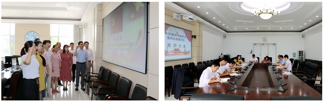 6月26日,机关党总支第四党支部组织全体党员开展“重温入党誓词,不忘入党初心”主题党日活动。全体党员面向党旗,高举右拳,重温入党誓词,铿锵的誓言,坚定的承诺,让每一位党员的心灵再次受到震撼和洗礼。党委委员宁艳杰以普通党员身份参加主题党日活动。随后,全体党员共同学习了《中国共产党党员教育管理工作条例》,支部书记戴长松讲授“我和我的祖国——点赞新中国 颂扬新时代”专题党课。大家纷纷表示,要坚定理想信念,充分发挥党员先锋模范带头作用,积极努力争创“党建工作一流”“管理服务一流”,为学校建设发展贡献力量。