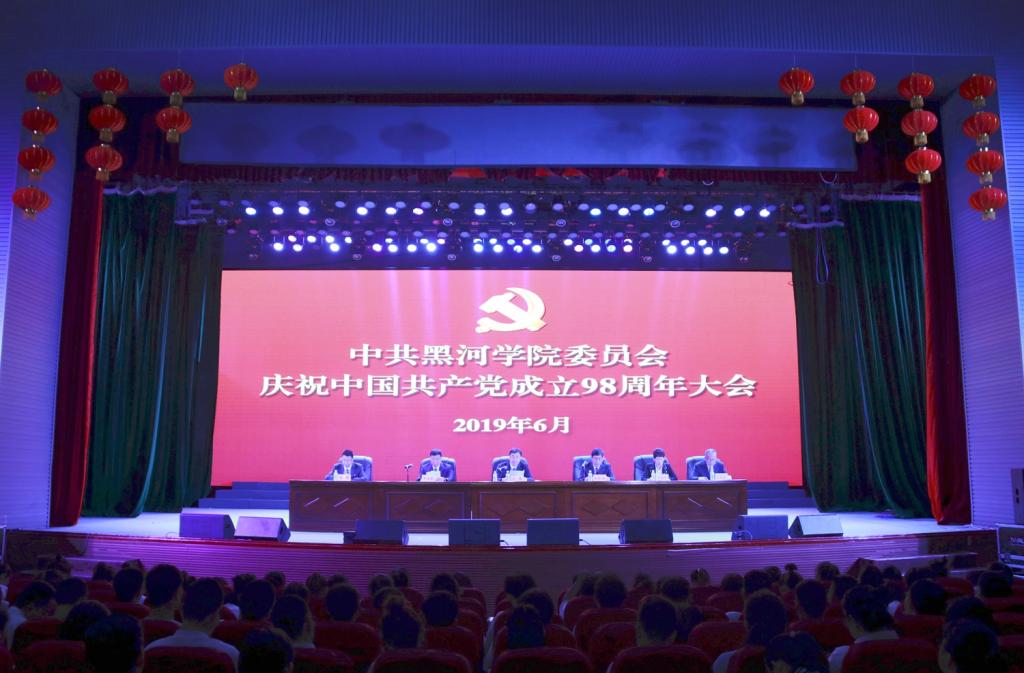 本网讯(记者 赵宇 摄影 关月)6月28日,在建党98周年即将到来之际,学校隆重举行中共黑河学院委员会庆祝中国共产党成立98周年大会,学校党政领导班子成员、各二级学院党政负责人、各职能部门负责人、全体党员、部分群众代表齐聚明德楼礼堂,共同庆祝党的生日,表彰“两优一先”集体和个人。党委委员、副校长张焕强主持大会。