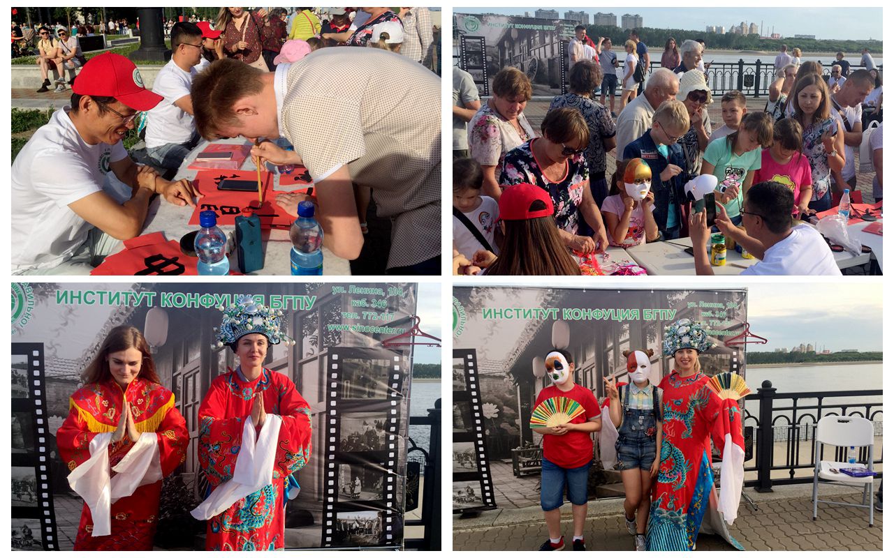 6月23—28日,以“加强文化旅游交流合作 促进两岸两国共同发展”为主题的第十届中俄文化大集在中国黑河市和俄罗斯布拉戈维申斯克市同期举办。我校与俄罗斯布拉戈维申斯克国立师范大学共建的孔子学院师生在活动中踊跃参与,为俄罗斯市民讲解中国传统文化,共同绘制脸谱、扇子,编制中国结,展示中国音乐、中国风装饰、中国功夫。同时,师生作为中俄文化传播的桥梁,承担了本届文化大集37项笔译、口译的翻译工作。