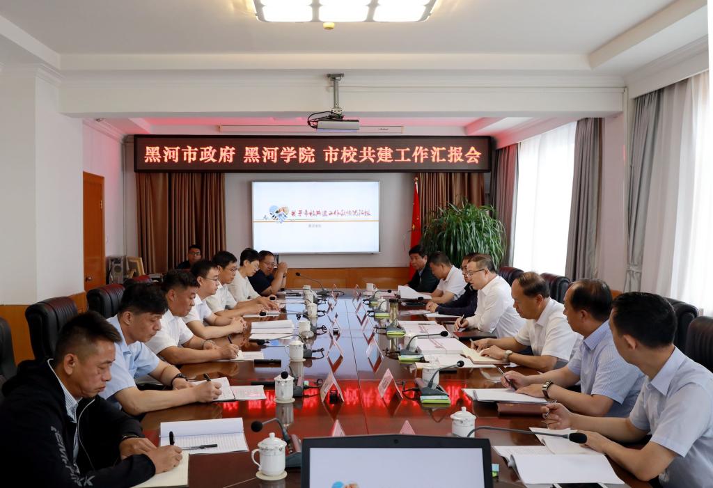 本网讯(记者 关月)7月24日,黑河市政府——黑河学院市校共建工作汇报会在黑河市政府举行,黑河市市委副书记、市长马里,副市长张瑾忠;我校党委书记王刚,副校长张焕强、车永宏就发挥各自优势、扩大合作领域、创新合作方式,推进相关事宜务实合作,进行了深入交流。市住建局、执法局、自然资源局、商务局、体育局,合作区管委会、爱辉区政府负责人及学校审计处、后勤管理处等相关部门负责人参加会议。