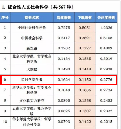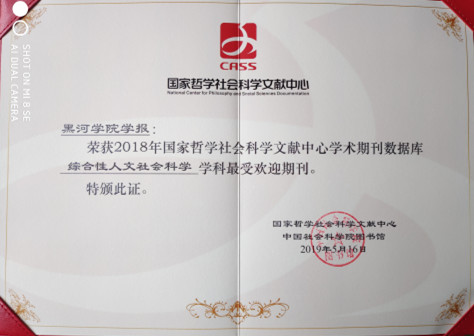 国家哲学社会科学文献中心学术期刊数据库,收录期刊覆盖22 个省、5 个自治区、4 个直辖市,涵盖哲学社会科学各个学科,是世界上体量最大的中文哲学社会科学学术期刊开放获取数据库。《国家哲学社会科学文献中心学术期刊数据库用户关注度报告(2018年)》,选取 2018 年 1 月 1 日以前上线的 1 881 种期刊,以在线阅读量与下载量作为基本统计指标,综合两个指标计为“关注度指数”,得出24类期刊受关注情况排序,综合反映了在过去某一时间段中用户对期刊的关注和使用情况。《黑河学院学报》在567家综合性人文社会科学期刊中排名第六,荣获最受欢迎期刊殊荣。