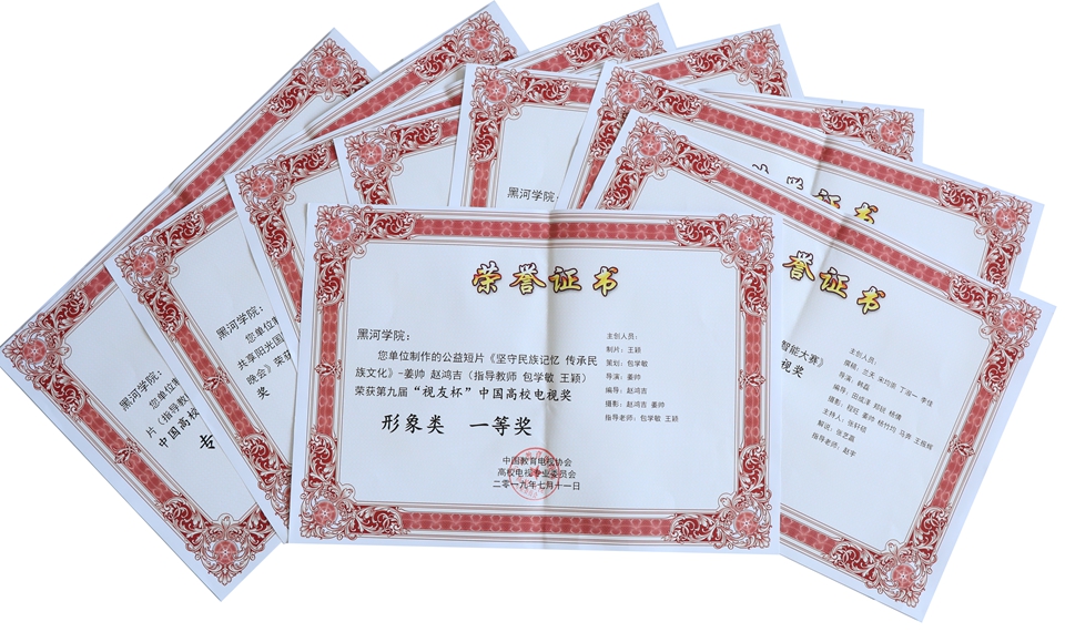 “中国高校影视作品推优及展映”活动自2019年6月10日启动以来,设新闻类、专题类、纪录片类、教学类、综艺类、形象类、微电影类、短视频类等八个类别,共收到来北京大学、清华大学、北京师范大学、中国传媒大学等全国100所高校报送的989部影视作品。经过激烈角逐,我校《坚守民族记忆 传承民族文化》荣获形象类一等奖;《运动会宣传片》荣获短视频类一等奖,《中国·黑河学院俄罗斯远东高校运动会快闪》荣获短视频类二等奖;《首届国际青年人工智能大赛》《黑河学院举办中俄青年友谊环校跑暨篝火晚会》荣获新闻类二等奖;《黑河学院创新创业学院》荣获专题类三等奖;《刀下芳桦》荣获纪录片二等奖,《卖茶叶蛋的老太太》荣获纪录片类三等奖。