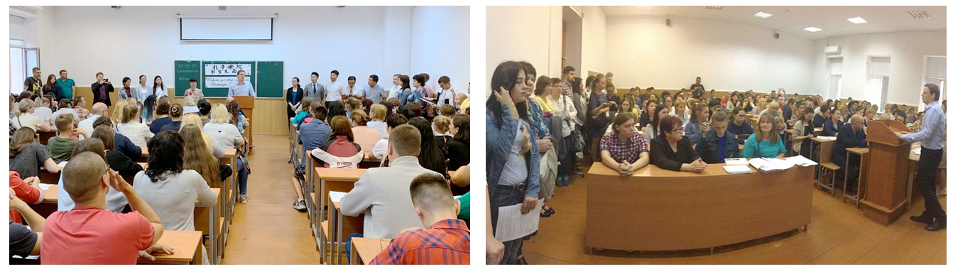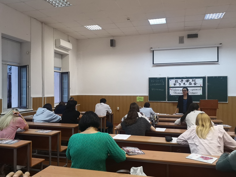 本网讯(特约记者 王晓梅)9月5日,我校与布拉戈维申斯克国立师范大学共建的孔子学院在222教室举行新生入学见面会,孔子学院俄方院长兼外事处长古哈连科·尼古拉、中方院长王晓梅、俄方教学主任古哈连科·谢尔盖与全体教师、200名孔子学院新生共同参加了见面会。
