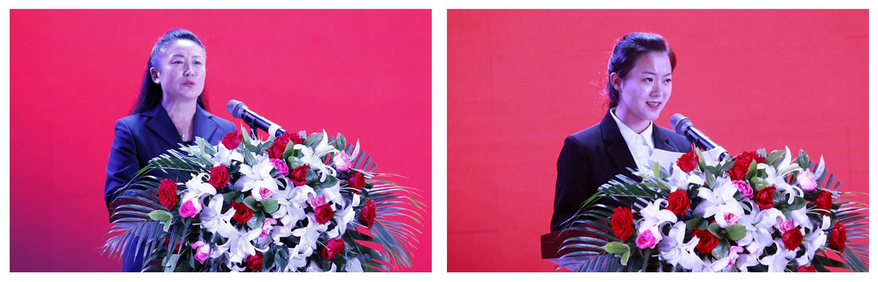 理学院教师邱敏在发言中表示教师节不单单是一个节日,更是对教师责任的提示,我们要牢记使命,在各自的工作岗位上,齐心协力,奋发进取,为高等教育事业更加美好的明天而共同努力。人文传媒学院杨凯帏代表全校学生向全体教师表达崇高的敬意和最诚挚的祝福,感谢恩师们的无私奉献和辛勤付出。