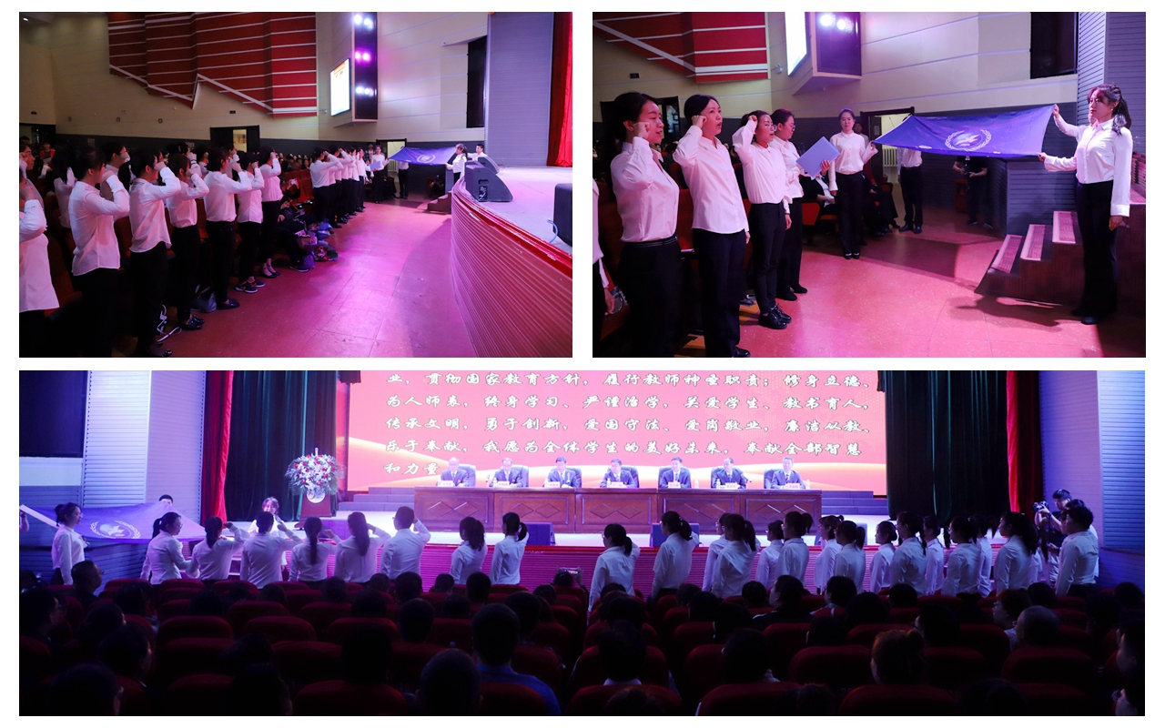“我志愿成为一名光荣的人民教师,忠诚党的教育事业,贯彻国家教育方针,履行教师神圣职责,修身立德,为人师表……为全体学生的美好未来奉献全部智慧和力量!”我校新入职的青年教师面对校旗立下誓言,立志牢记教师使命、铭记教师职责、全身心投身教育事业。