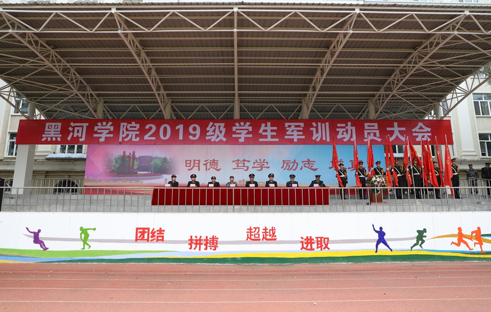 动员会上,中国人民解放军32110部队排长谢林涛上尉宣读了《黑河学院2019级学生军训计划》及《考核评比办法》;副参谋长郝德峰中校向黑河学院军训大队授旗,副校长许海深为各学院授黑河学院军训中队旗。