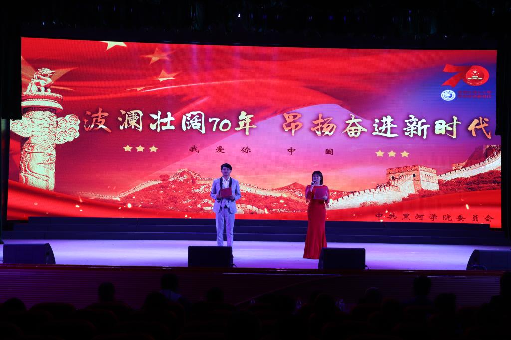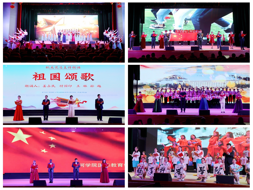 经过市直机关工委、黑河市文学艺术界联合会、爱辉广播电视台等校内外评委现场打分,音乐学院党总支朗诵的《我深深爱恋的祖国》荣获比赛第一名,人文传媒学院党总支朗诵的《永远的赞歌》、机关党总支朗诵的《祖国颂歌》荣获比赛第二名,文化旅游学院党总支朗诵的《走向世界舞台的中国》、国际教育学院党总支朗诵的《祖国啊,我亲爱的祖国》、教育科学学院党总支朗诵的《我骄傲,我是中国人》荣获比赛第三名。