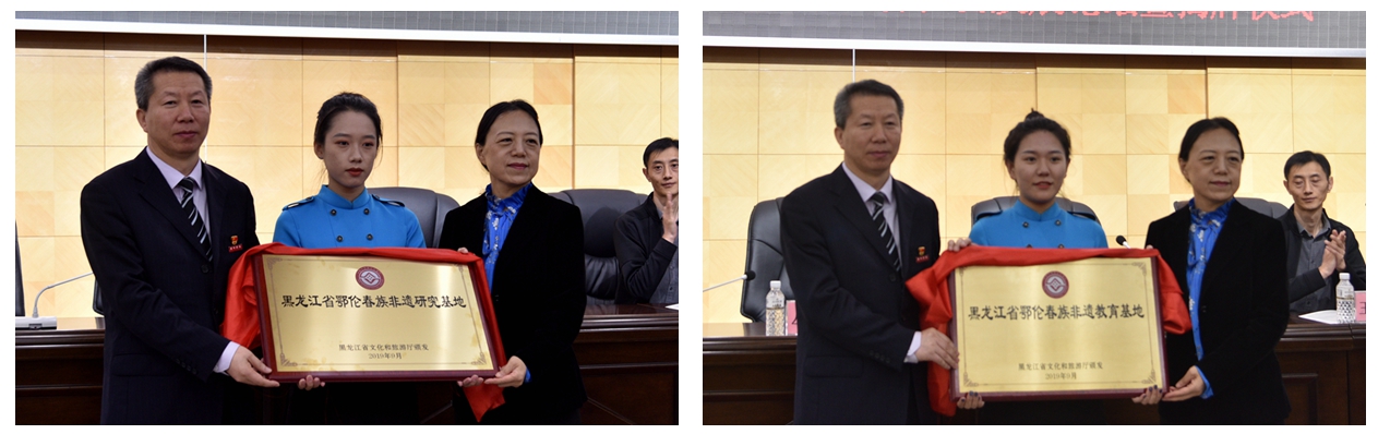 黑龙江省文化和旅游厅非物质文化遗产保护处处长曹洪林,黑河市爱辉区人民政府党组成员、副区长赵丽华,我校副校长丛喜权与来自全国各高校的专家学者、各级传承人、鄂伦春族民族人士代表及我校师生百余人参加了揭牌仪式。