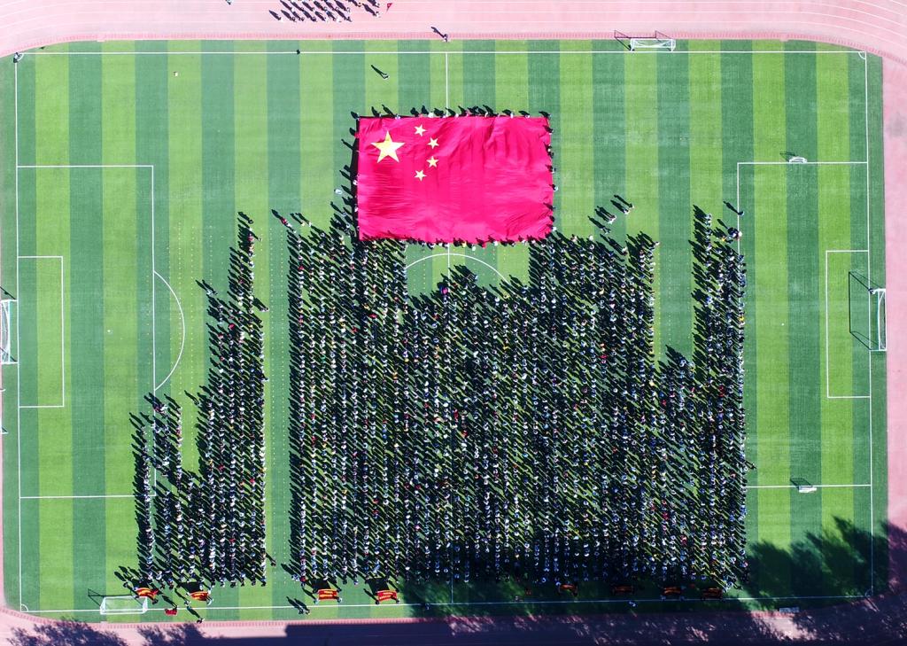 庄严的国旗传递仪式现场,数十名学生高擎的巨幅国旗从4000余名师生头顶缓缓拂过,所到之处,大家举起双手深情地托举抚摸国旗,此刻,强烈的爱国情感在师生心中流淌,大家心潮激荡,热血沸腾。全体师生齐声高唱《我和我的祖国》,操场上汇成了一片热烈欢腾的红色海洋,表达了北疆师生对新中国成立70周年华诞的深情祝福。