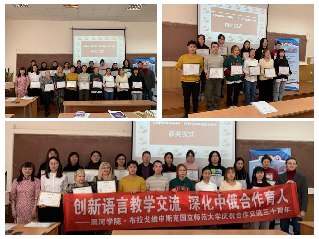 本次30年教学合作成果国际节还分别在中俄两所高校举办了“中俄建交70周年”中文、俄文作文大赛及硬笔书法大赛。布师大孔子学院俄方院长尼古拉、中方院长王晓梅、教学主任谢尔盖为本次比赛中的获奖选手颁发了获奖证书及奖品。