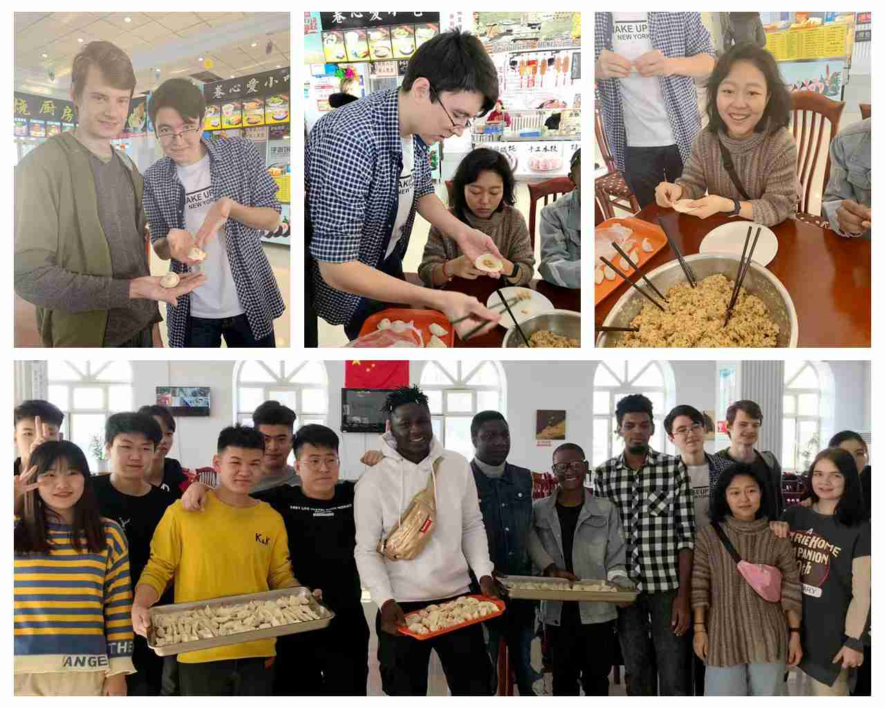 本网讯(特约记者 王景荣)饺香团圆暖冬日,欢声笑语满校园。为进一步加强中外文化交流,弘扬中华传统文化,让寒假期间在校留学生过一个安静祥和的新年。2020年1月1日上午,国际教育学院在友谊楼餐厅举办了“元旦团圆汇 浓聚中国情”中外学生联谊会。国际教育学院党总支书记王永、院长曲兆东,辅导员教师及全体在校中外留学生参加活动。