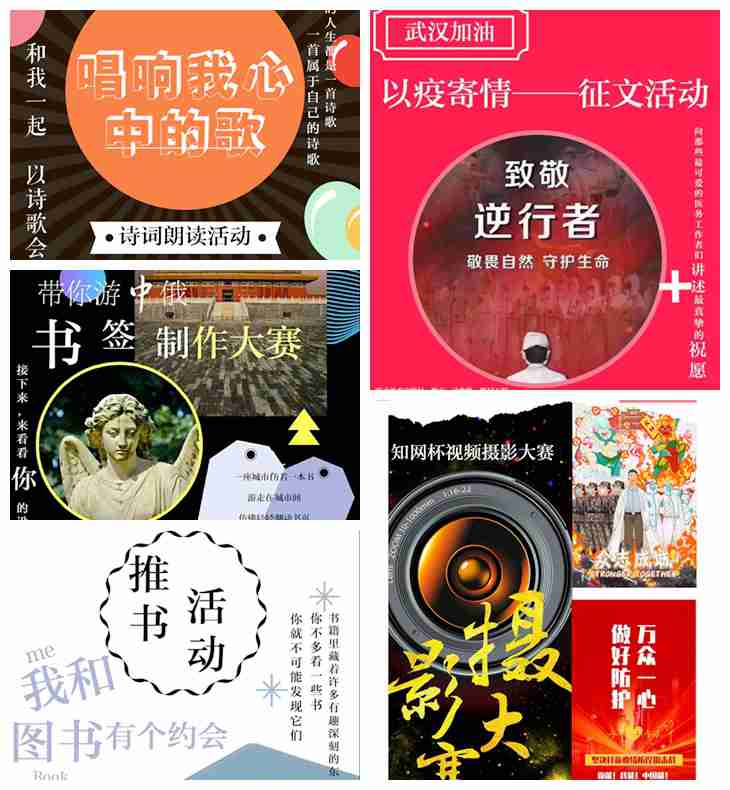 校图书馆陆续组织开展“以疫寄情——征文活动”“唱响我心中的歌——诗歌诵读”“带你游中俄——书签制作大赛”“知网杯短视频大赛”“ 我和图书馆有个约会——推书”活动,鼓励学生以文字抒发疫情期间的所见、所闻、所感,表达敬意;用声音传递知识,分享阅读魅力;通过坚定的信念,真挚的话语影像,录下阅读的美好瞬间;制作创意的书签,为沐浴书香留下难忘回忆;推荐经典著作,赴一场春暖花开的书海之约。