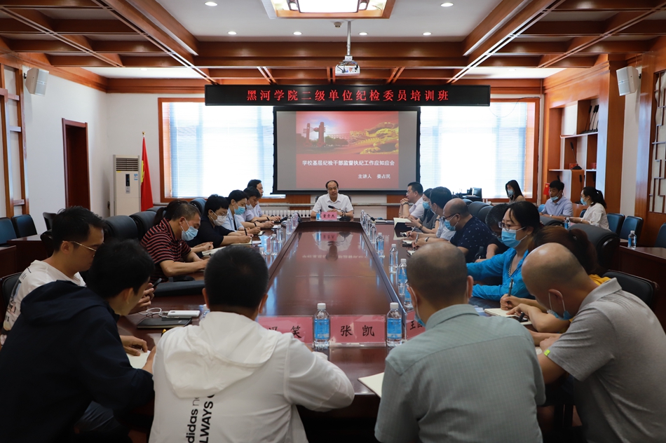 本网讯(特约记者 王琳)7月8日下午,校纪委在明德楼三楼会议室举办了二级单位纪检委员培训班。本次培训主要内容是《学校基层纪检干部监督执纪工作应知应会》《中华人民共和国公职人员政务处分法》。全校18个党总支(直属党支部)的纪检委员和纪检监察处全体工作人员参加了培训学习。党委委员、纪委书记、省监委驻黑河学院监察专员董贵杰参加并主持培训活动。