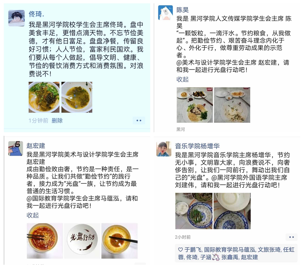 用实际行动响应“光盘”,黑河学院师生利用微信公众号、QQ群、微博、抖音等平台全面开展了“厉行勤俭节约 反对餐饮浪费”宣传倡议活动,倡导师生养成勤俭节约、文明用餐的生活习惯,同时,“光盘行动”创意海报大赛、支教学生的一堂“光盘行动”主题课等活动也正在积极进行中。