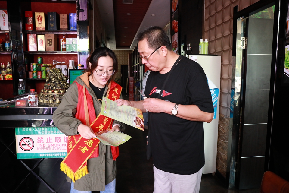 本网讯(记者 赵宇 摄影 关月)“您愿意加入‘光盘族’吗?您能否做到适量点餐、打包剩菜?请您在聚餐时别忘了使用公筷……”近日,由黑河学院团学干部和黑河籍学生组成的“光盘行动”志愿者团队来到中央街一带的饭店,一遍遍和店主与顾客沟通着。