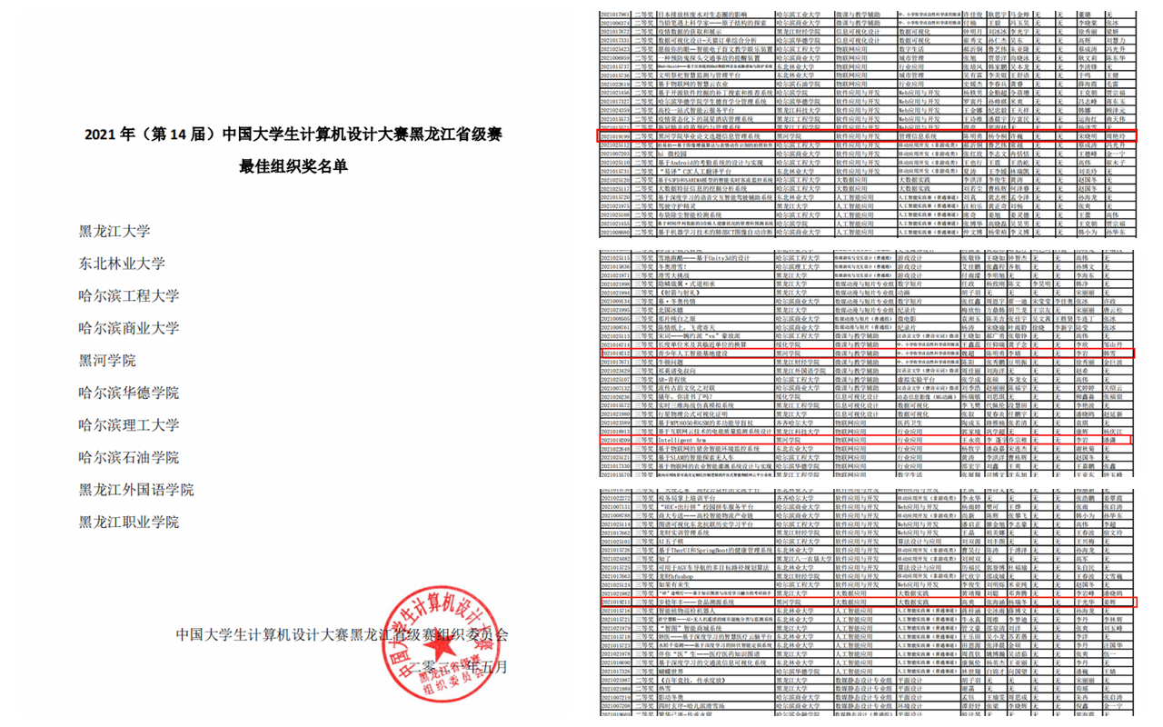5月11日,第14届中国大学生计算机设计大赛黑龙江省赛圆满落幕,我校共推选14支队伍参赛,经过激烈角逐,由计算机与信息工程学院宋晓明老师指导,陈明勇、杨令桐、许巍同学设计的参赛作品《黑河学院毕业论文选题信息管理系统》获得省赛二等奖,直接晋级国赛评比;于光华老师指导的高爽、张海涵、杨瑞冬同学设计的参赛作品《岁稔年丰——食品溯源系统》,李岩老师指导的王永亮、李蓬宇、乔宗稚同学设计的参赛项目《Intelligent Arm》,韩雪老师指导的魏超、陈明勇、李婧同学设计的参赛项目《青少年人工智能基地建设》均荣获省赛三等奖;我校荣获“最佳组织奖”。“中国大学生计算机设计大赛”于2019年列入全国高校竞赛评估排行榜,该项赛事始创于2008年,是由教育部高等学校计算机类专业教学指导委员会、软件工程专业教学指导委员会、大学计算机课程教学指导委员会联合主办的全国大型竞赛。