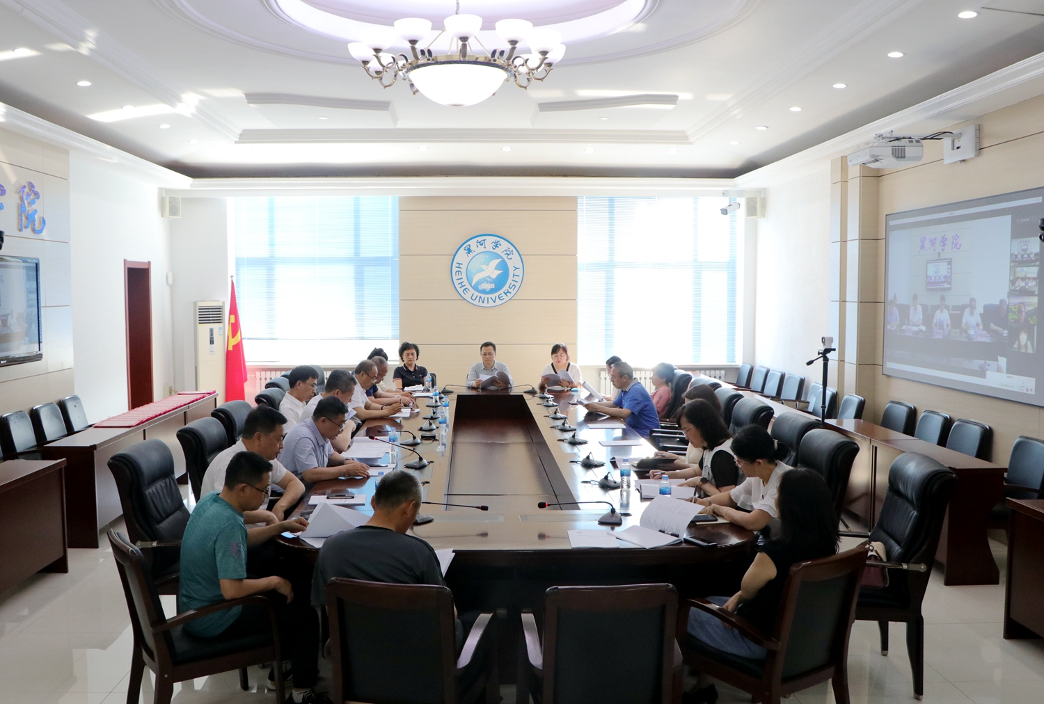 本网讯(特约记者 万红 摄影 杨倩)6月24日,学术理论研究部在明德楼二楼会议室同步召开线上线下《黑河学院学报》编委会换届会议。学报主编杨敬民、学报副主编丛喜权,中方编委会委员及俄罗斯编委委员A·B·德鲁佳卡、C·B·库哈连科、O·B·扎列斯卡雅参加会议。会议由副校长丛喜权主持。