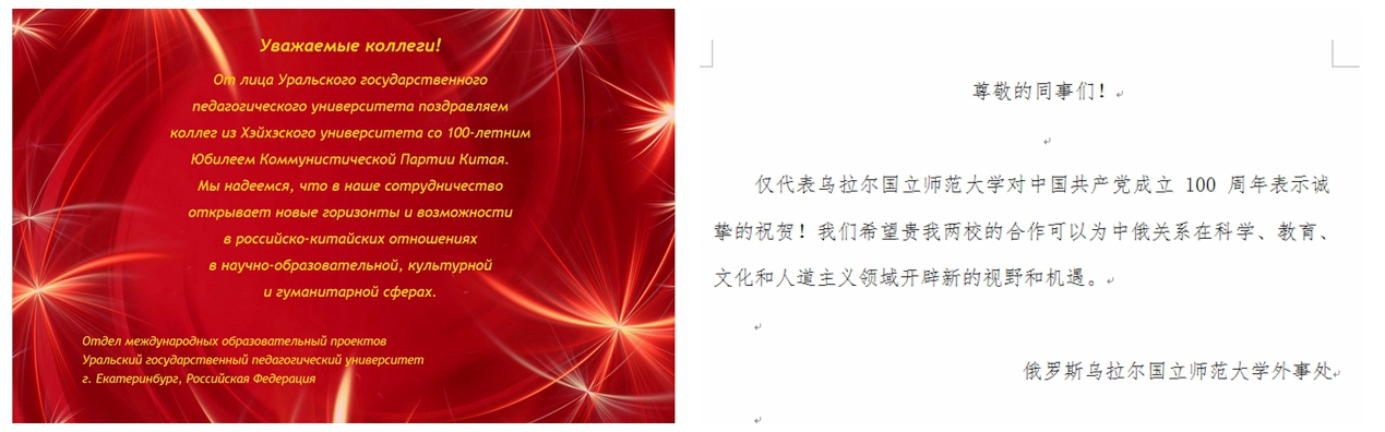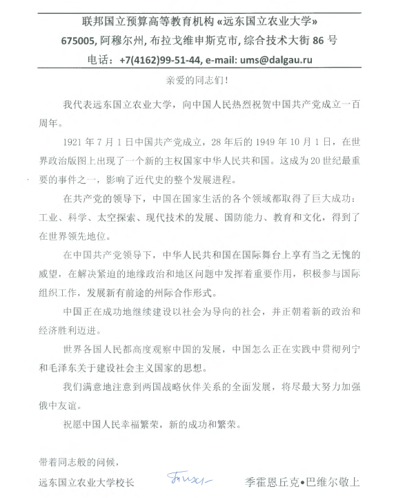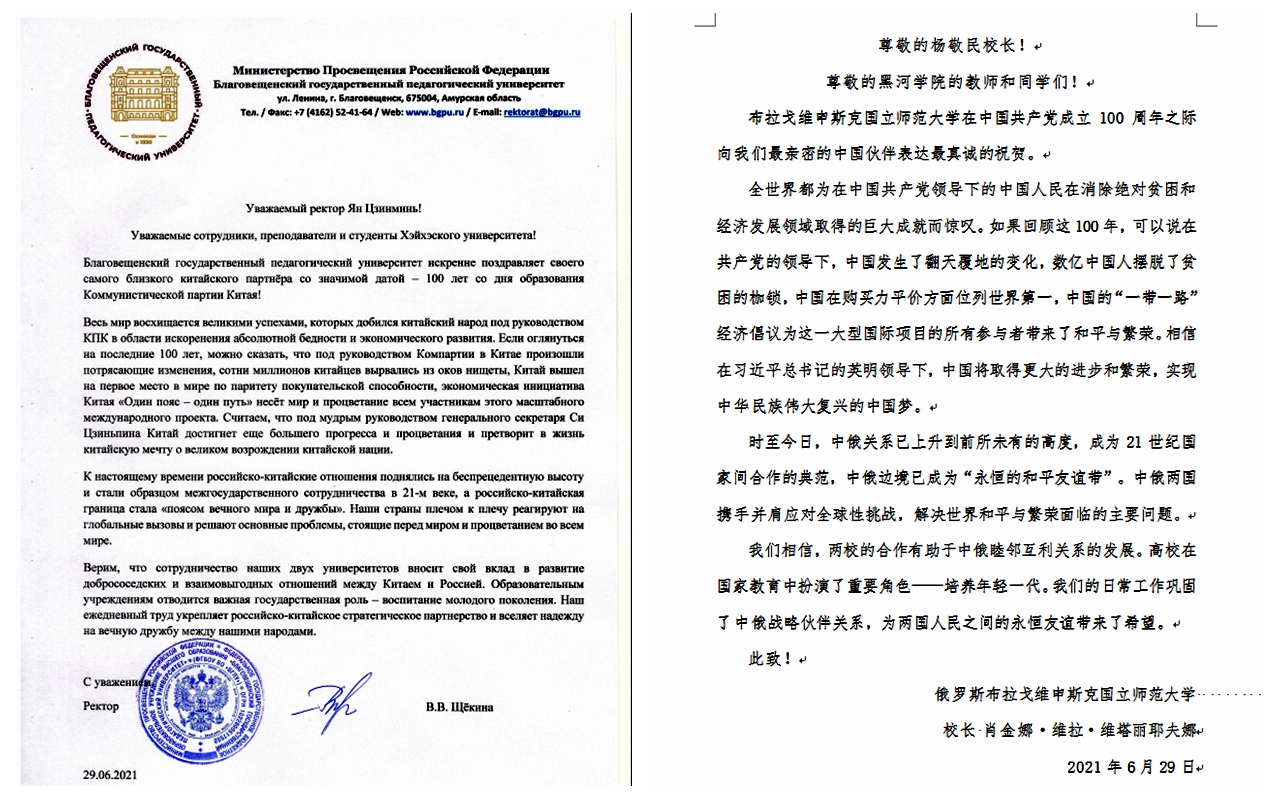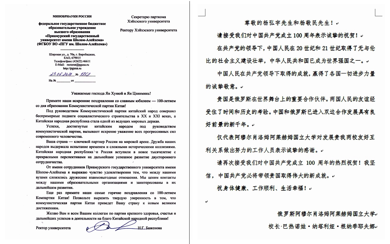 在中国共产党成立100周年之际,与我校友好交往的俄罗斯布拉戈维申斯克国立师范大学、俄罗斯阿穆尔肖洛姆·阿莱赫姆国立大学、俄罗斯乌拉尔国立师范大学、俄罗斯阿穆尔国立大学、俄罗斯远东国立农业大学纷纷向我校发来贺信,祝贺中国共产党成立100周年。