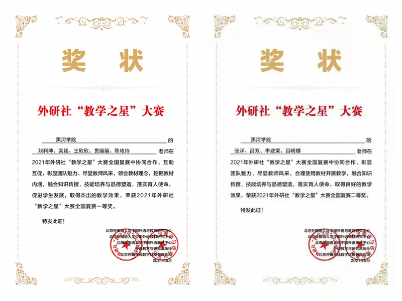 近日,2021年外研社“教学之星”大赛全国复赛结果揭晓,由我校外国语学院刘利坤、栾颖、王欣欣、贯丽丽、陈艳玲组成的教学团队荣获外研社“教学之星”大赛全国复赛一等奖,通识教育学院教师张洋、吕双、李建荣、吕晓娜组成的教学团队荣获二等奖。外研社“教学之星”大赛是由教育部高等学校大学外语教学指导委员会、教育部高等学校英语专业教学指导分委员会、外语教学与研究出版社、北京外研在线教育科技有限公司共同主办的面向全国高等学校外语教师的大型赛事,在全国高校外语教育领域广受认可。我校参赛教学团队围绕参赛主题“培根铸魂,启智增慧”,多次通过线上视频会议、线下交流等方式研讨课程设计,集思广益,团结协作,深入挖掘外语课程中的思政育人元素,教学设计构思巧妙,重点难点突出,以精彩的课程整体设计和生动的授课方式充分展现了我校外语教师良好的专业素养和优秀的教学能力,获得了评审专家的高度认可。