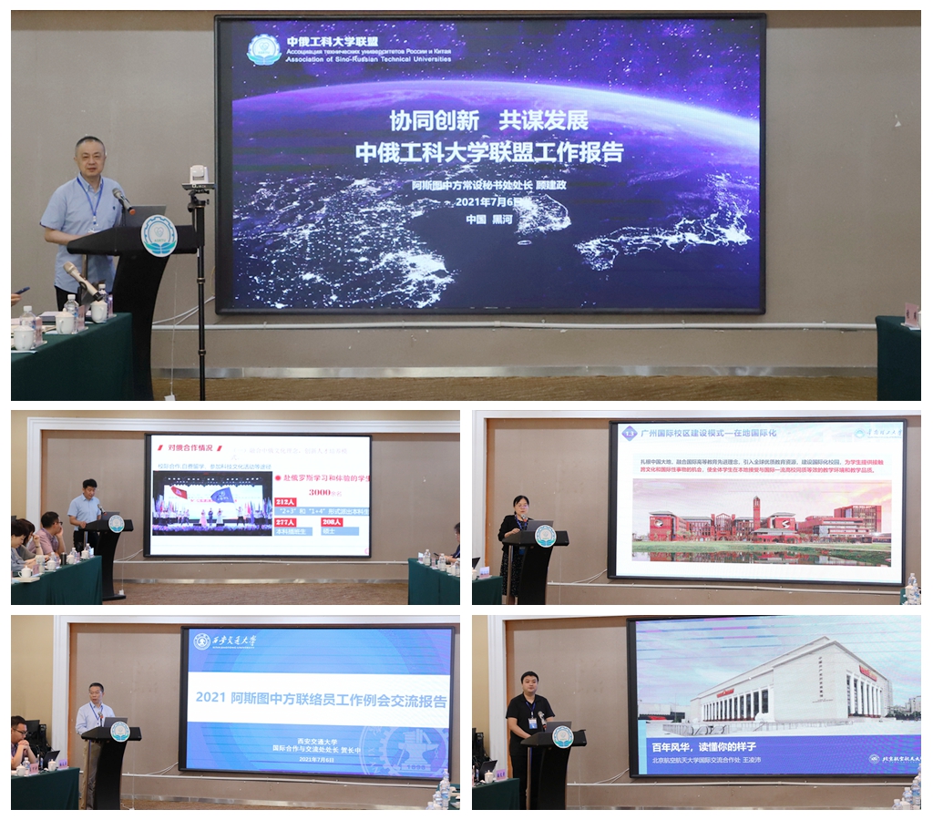 会上,顾建政代表阿斯图中方常设秘书处向大会作了工作报告,全面总结了联盟2020—2021年的建设情况及未来发展规划。黑河学院、华南理工大学、西安交通大学、北京航空航天大学的国际交流合作处负责人结合中俄战略合作最新动态,围绕各自学校国际交流合作发展现状和未来规划等方面作了工作报告。